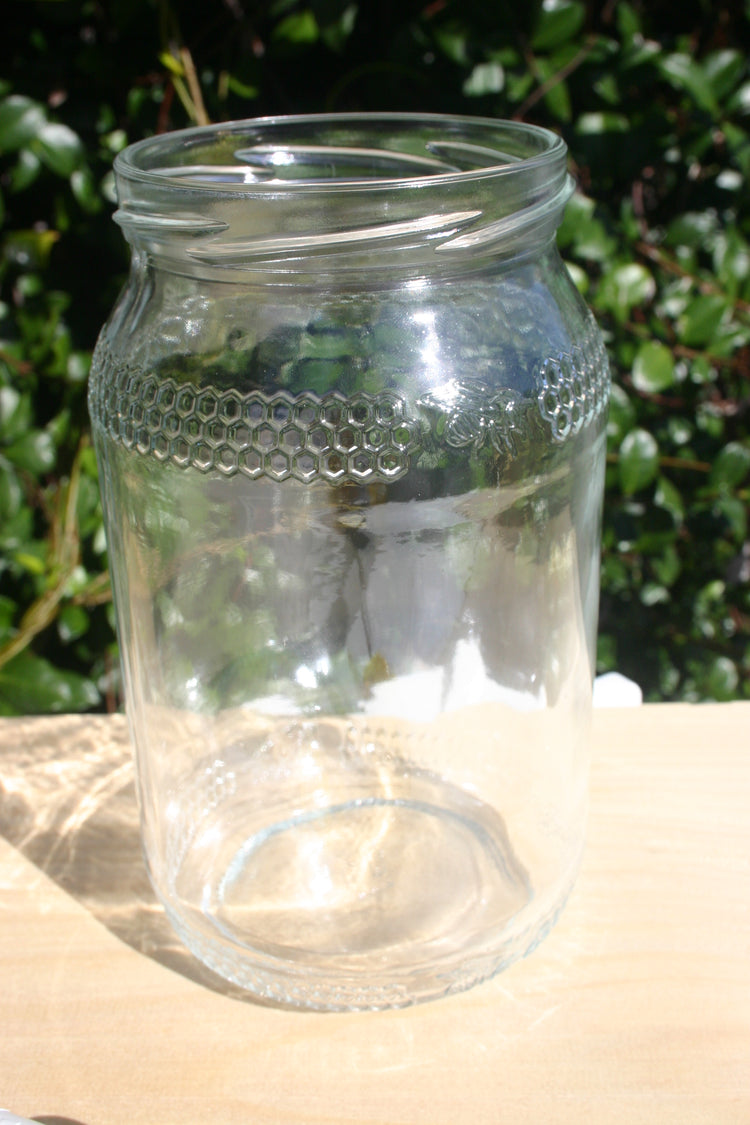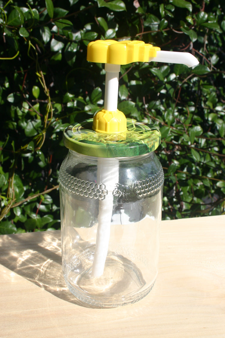 900ml (1.1kg) bottle embellished with comb honey pattern and bee design. Pump is hardy and designed to scale for smaller or larger glass bottle. Two lids enable pump to be used in standard 375ml bottle or the 900ml bottle. Lids feature a range of bees in nature photographic images.